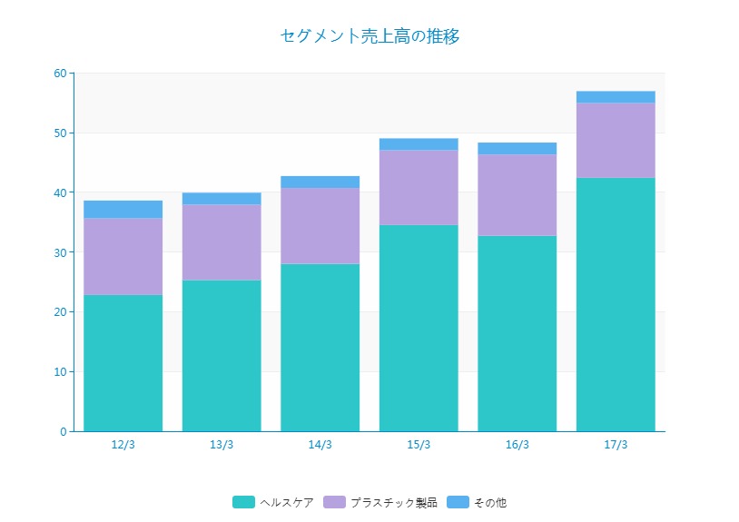 12/3期から17/3期の売上高増加の原因はコンドームが含まれるヘルスケア事業です。12/3期に22億円だった売上高は42億円まで増加しています。プラスチック製品は12-13億円程度で推移し、その他事業は2億円程度で推移しています。