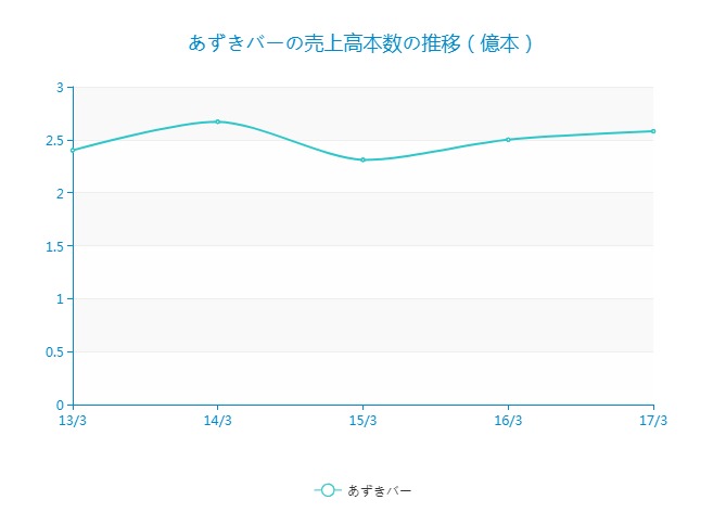 あずきバーの売上高本数の推移です。14/3期は「あずきバー」40周年による積極的な販促活動から2.67億本まで販売を伸ばしました。16/3期にはプレミアム品のゴールドあずきバーの投入、16年4月には10%の値上げをしながらも数量を伸ばし17/3期は2.58億本と順調に回復しています。