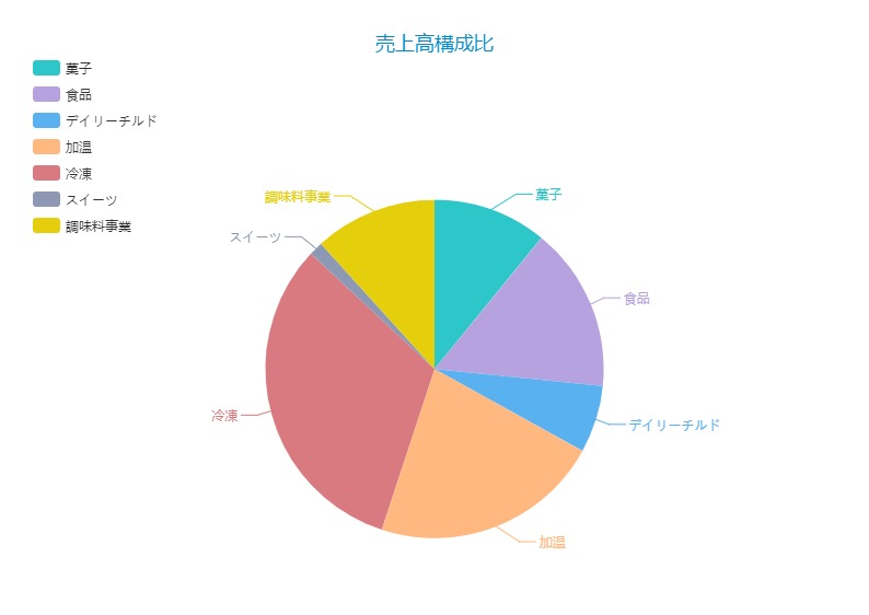 この円グラフを見ると、売上高の半分以上をアイスの冷凍と肉まん・あんまんなどの加温が占めており、コンビニにおいてあるアイス、肉まん・あんまんといった馴染みやすい商品が多いようですね。