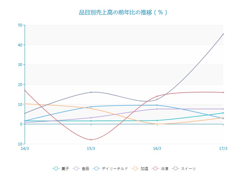 アイス含む冷凍が15/3期こそマイナスだったもののその後は15%程度と力強く推移しています。他の事業も総じて安定的に伸びている姿が見てとれます。伸びている製品が多いので組織自体が活発化している可能性もありそうです。