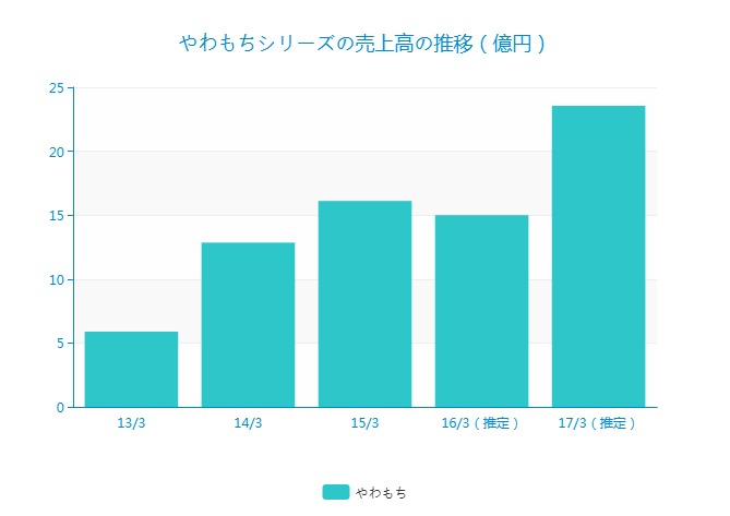 やわもちシリーズの売上高を推定しています。15/3期までは正しい数字ですが、16/3期以降は推定です。もしかしたら16/3期以降はもっと多いかもしれません。5年間で20億円程度は売上高が増加していると推察できます。