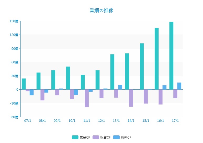 投資CFは、企業買収による無形固定資産の取得、自社生産品をつくるための工場建設による支出がほとんどです。