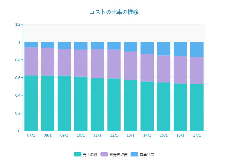 販売管理費の比率が30%程度で推移するなかで、売上原価の比率が下がり、営業利益の比率が上昇しています。