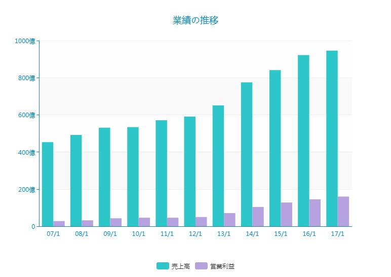 直近の17/1期は売上高946億円、営業利益160億円となっています。10年で利益は5倍以上になっています。