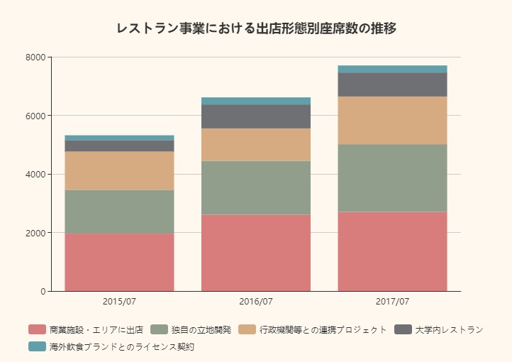 また、出店形態別の座席数の推移を見てみると、商業施設への出店のほかに、独自の立地開発によって座席数を伸ばしていることを見て取れます。