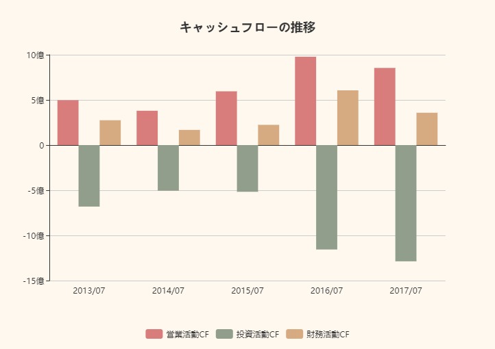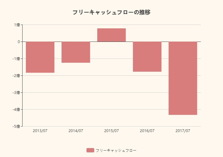 次にキャッシュフロー、フリーキャッシュフロー(営業キャッシュフローと投資キャッシュフローの合計)をそれぞれ見てみると、バルニバービは、引き続き積極的な投資姿勢を維持していることがわかります。