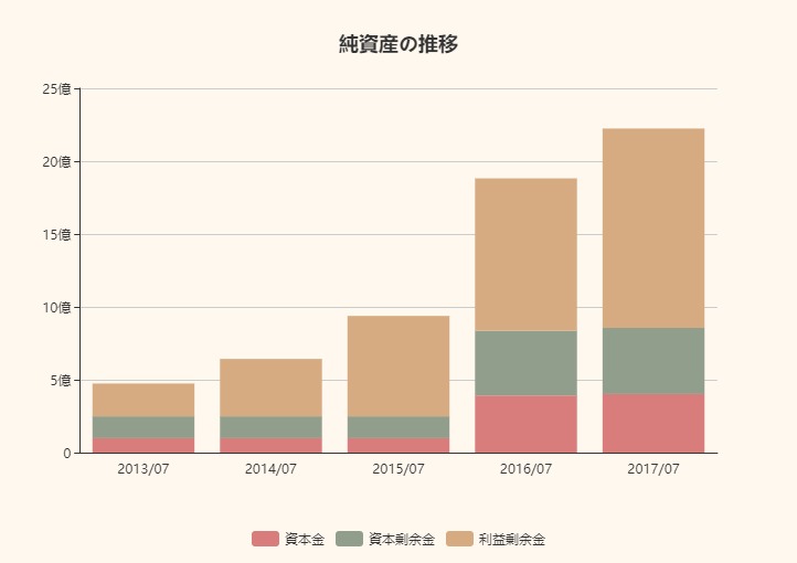 純資産の推移を見てみると、2015年10月の上場を反映して、2016年7月期に資本金・資本剰余金が増大していることがわかります。一方で、利益剰余金は、毎年着実に積みあがっていることがわかります。