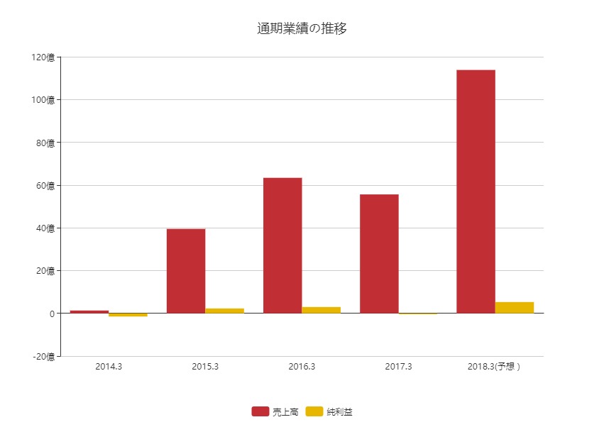 来期予想は売上高が約113億円、経常利益は7.5億円(前期比125倍!)とのこと。経常利益は過去最高値の2016年3月期の3.32億円と比べてもほぼ倍の予想です。