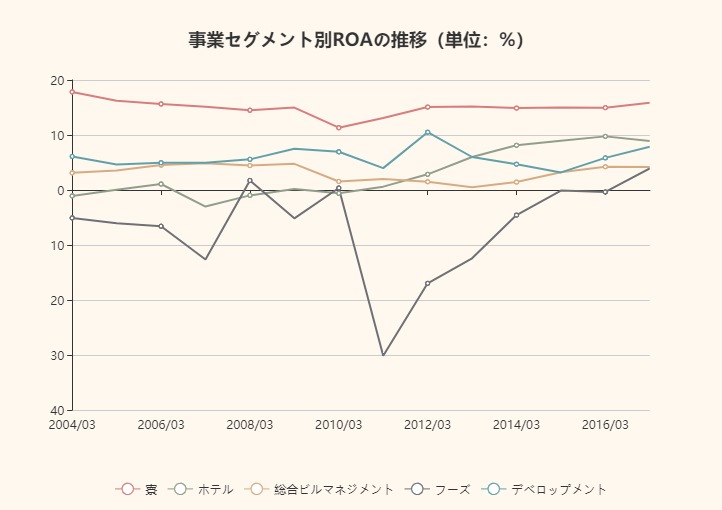 寮事業は営業利益率が安定しているのみならず、ROAも高水準で安定していることがわかります。