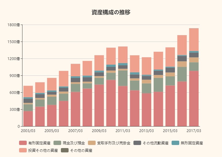 有形固定資産は一時的に減少するものの、総資産の大半を占めていることがわかります。