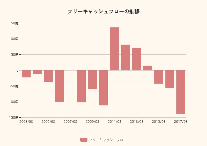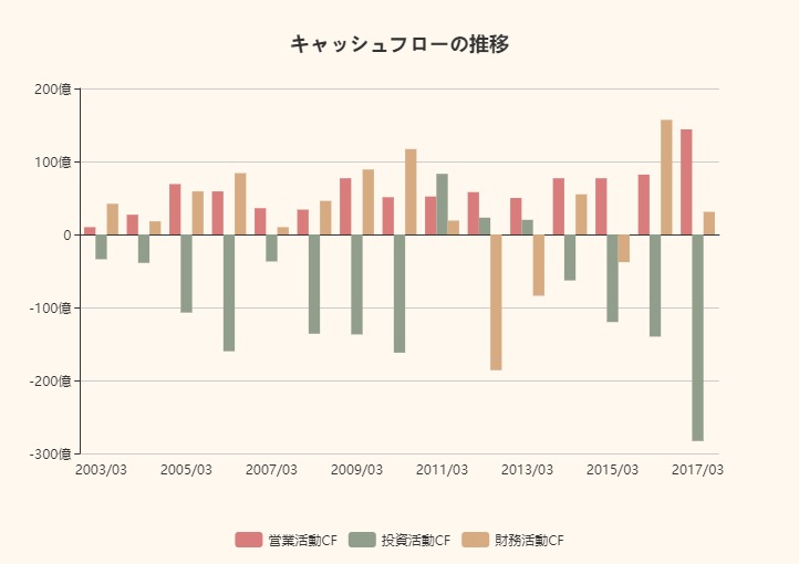 キャッシュフロー、フリーキャッシュフロー(営業キャッシュフローと投資キャッシュフローの合計)をそれぞれ見てみると、共立メンテナンスは事業が好調なものの、積極的な投資姿勢を崩していないことがわかります。