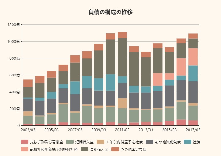 負債の推移を見てみると、一見、長期借入金が減少しているように見て取れますが、転換社債型新株予約権付社債を発行しているため、資金調達手段の多様化を図っていることがわかります。