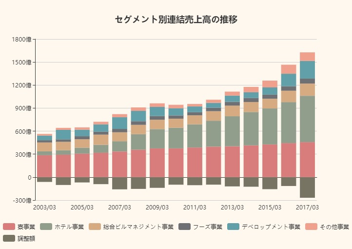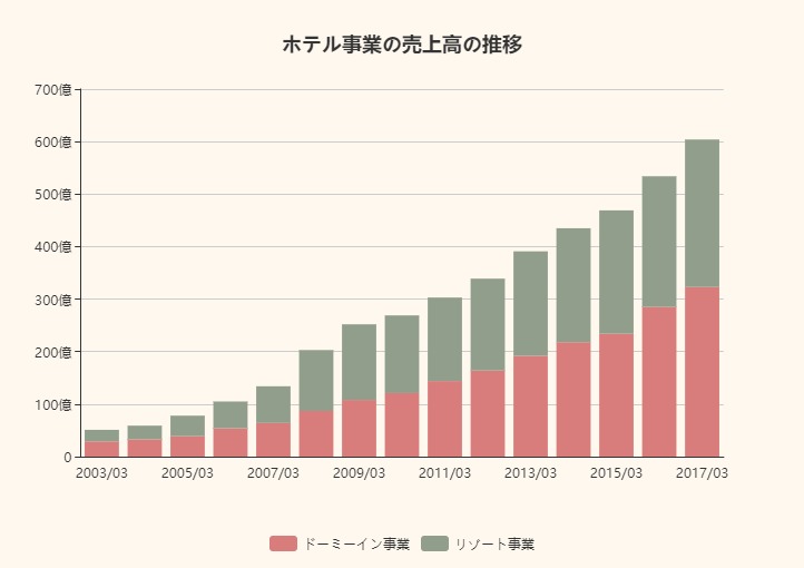 2003年3月期の51億円と比較して、2017年3月期は604億円であり、過去15年で約12倍に増加しています。ドーミーイン事業、リゾート事業それぞれ堅調に売上が増加していることがわかります。