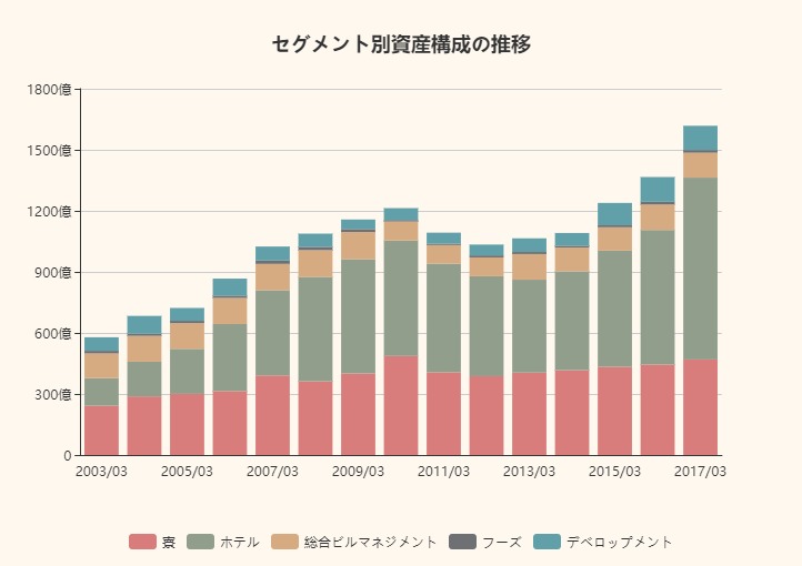 次に資産構成をセグメント別に見てみると、高水準で営業利益率が推移している寮事業よりも、近年、売上が急成長しているホテル事業の方が大きいことがわかります。