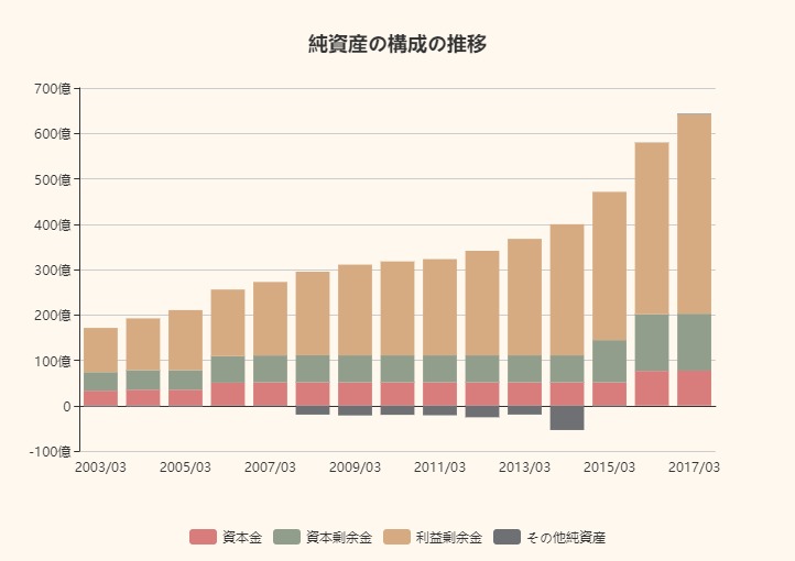 次に、純資産の推移を見てみると、好調な事業を背景に利益剰余金が着実に増えていることがわかります。