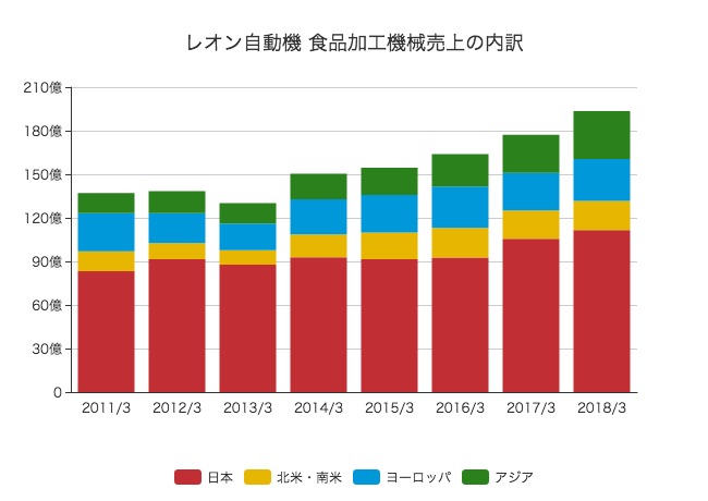 食品加工機械による売上193億円のうち、日本が112億円と、58%ほどを占めています。
