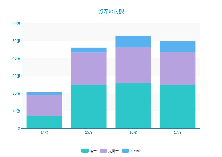 資産は、現金、売掛金がほとんどです。なお、15/3期に急に現金が増加していますが、上場の時に得た資金が積みあがっています。