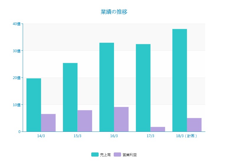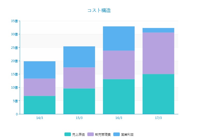 17/3は売上高32億円、営業利益1.7億円と売上高は順調に増加しているものの、営業利益は減ってしまっています。
