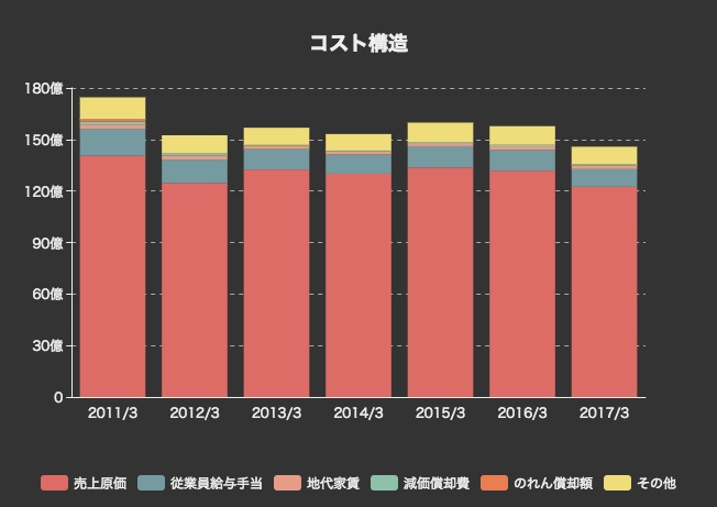 売上原価が150億円弱を推移しており、売上高の7割ほどを占めています。