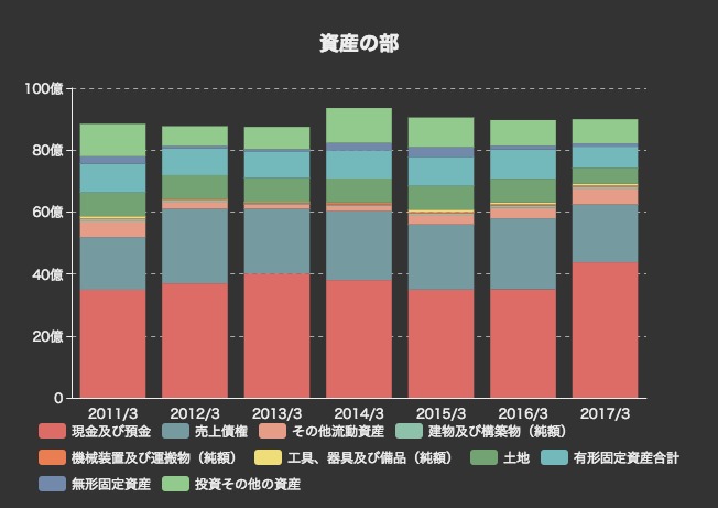 全体を占める割合で見ても2017/3期には現金が全体の半分以上を占めています。