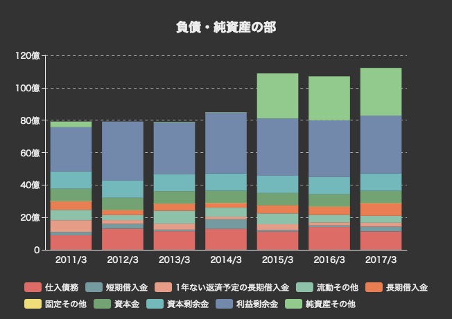 現金及び預金が2011/3期には34億円であるのに対し2017/3期では43億円と増加しています。