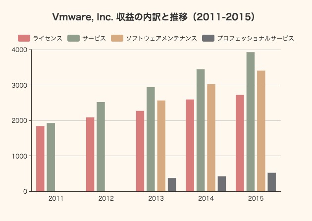 Vmwareの収益はライセンスとサービスという大きく二つの形式があり、サービス収益の中にはソフトウェアメンテナンス、プロフェッショナルサービスの2つが含まれている。2013年以降についてはサービスの内訳の収益額も載せている。