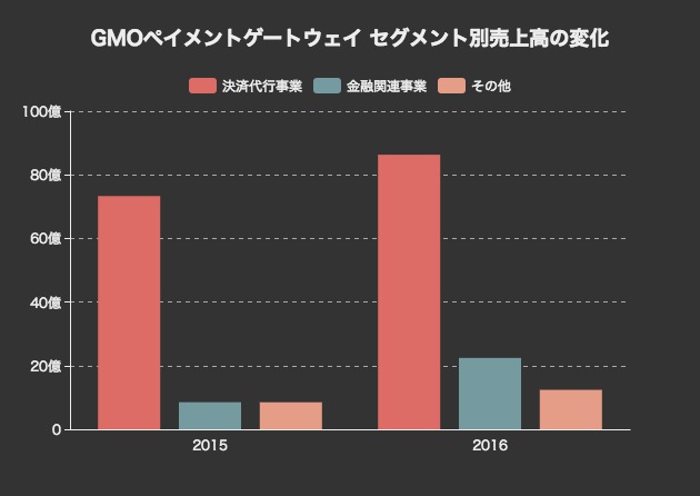 決済代行事業は前年比で+17%の伸び、金融関連事業が+163%、その他は+46%の増加となっている。金融関連事業単体の伸びは14億円ほどか。