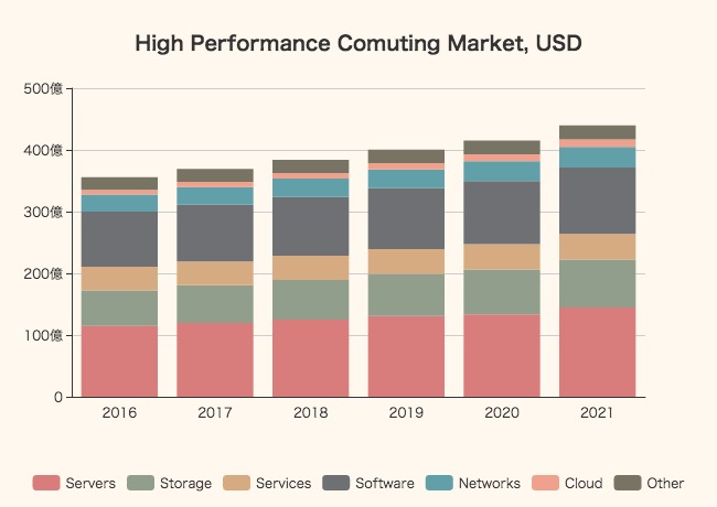 世界の高性能コンピュータ(HPC)市場は2016年の356億ドルから2021年には439億ドルに成長する見込み(年平均4.3%)。
