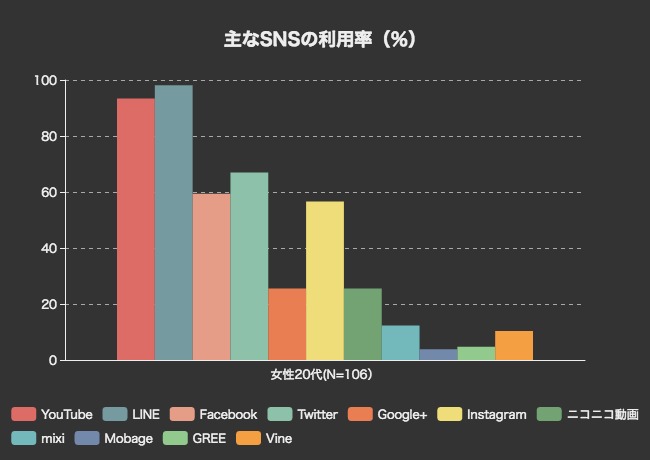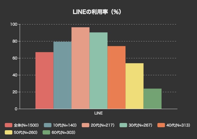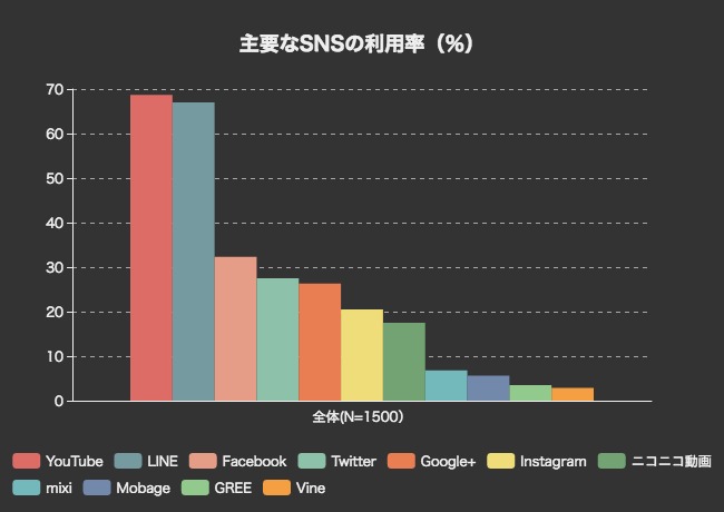 続いて、主要なSNSの利用率がどのように違うかをチェックしてみましょう。