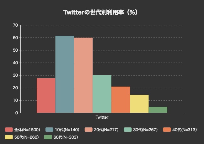 しかし、10代の61%、20代でも60%がTwitterを利用しており、若い世代によく使われていることがわかります。