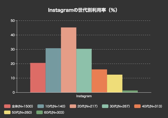 ちょっと前までは「おじさんおばさんがいないから、Instagramは居心地がいい」と言われていましたが、実際にその通り、20代の45%が利用する一方、30代では30%、それ以上の世代では20%も使っていないという状況でした。