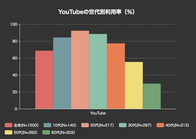 続いてYouTube。LINEと同じ、いやそれ以上に使われていることが分かります。全体では68.7%と、LINE(67%)を超えています。