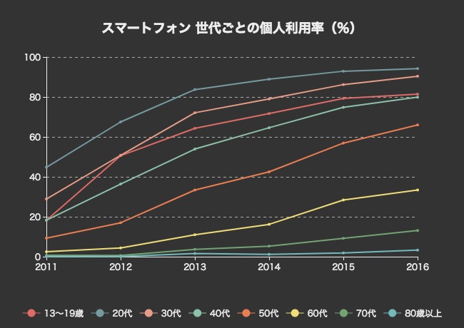 スマートフォンの利用率を、世代ごとでも見てみましょう。