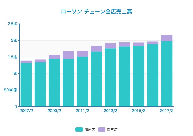 ローソンのチェーン全店売上高は2兆円ほど。そのほとんどを加盟店(フランチャイズ)が占めていることが分かります。
