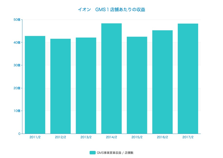 総合スーパー1店舗あたりの収益は、40億円から50億円の間で推移。店舗数が変わらないため、この値がGMS事業の営業収益を最も左右しています。