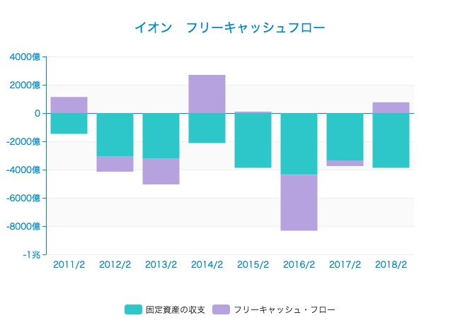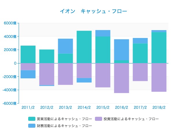 営業キャッシュフローには波があるようで、2016/2期は432億円だったのに対し、2018/2期には4639億円にまで増えています。