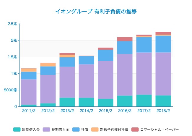 さて、フリーキャッシュフローがマイナスにおちいる中、イオングループの有利子負債は増大を続けています。