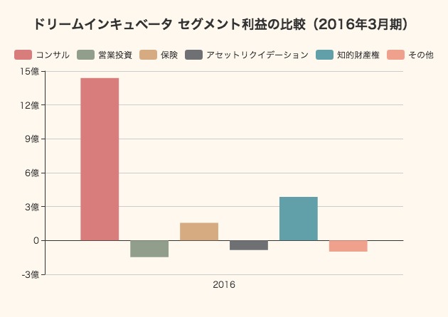 セグメント利益を比較すると、コンサルティングセグメントが14億円を稼ぎ圧倒的。つまり、ドリームインキュベータはコンサルティング事業で稼ぎながら、他の事業を育てていくモデルになっていると思われる。なるほど。