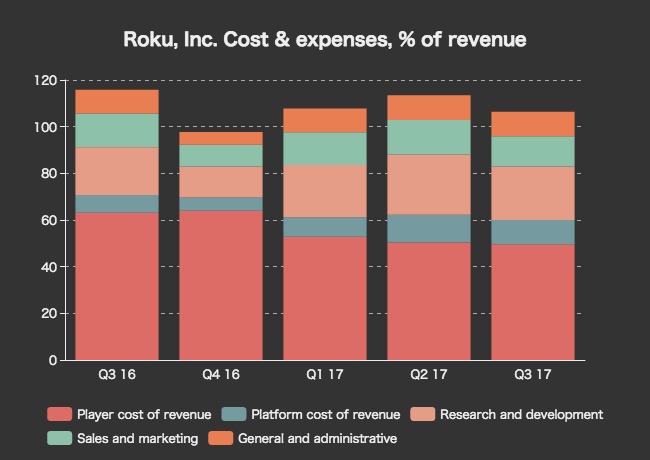 費用として最も大きいのはハードウェアの売上原価(Player cost of revenue)ですが、全体売上に対して63%あったのが直近では49.6%へと大きく改善しています。