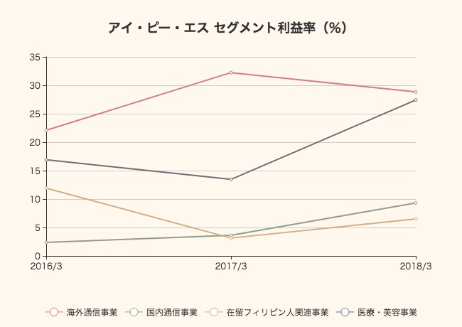 海外通信事業の利益率は30%前後と非常に高くなっています。医療・美容事業も27%と高いですね。