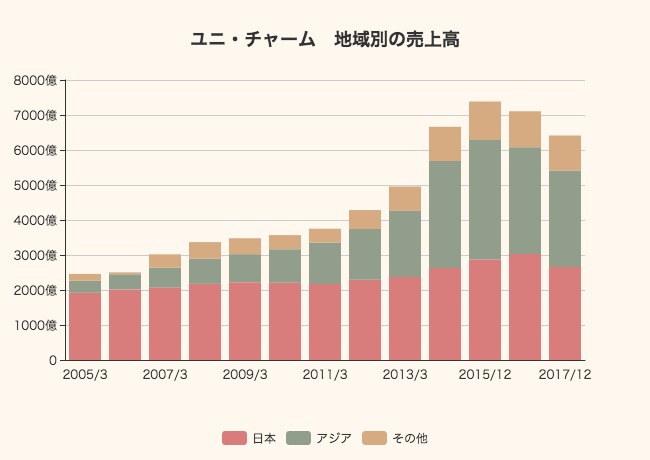 ユニ・チャームの売上高を地域別で切り取ってみると、何が増えたのかがさらに分かりやすくなります。