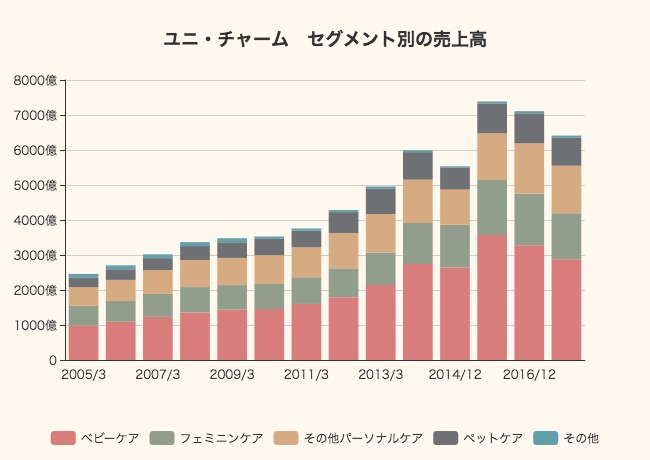 主力となっているのはベビーケア関連で、2017年には2880億円(45%)の売上をあげています。