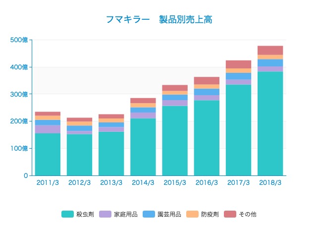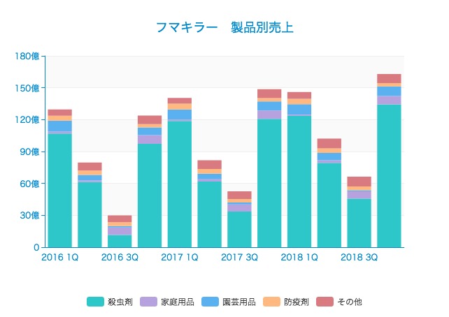 2018/3期の数字をみると、殺虫剤318億円、家庭用品18億円、園芸用品26億円、防疫剤15億円、その他33億円となっています。