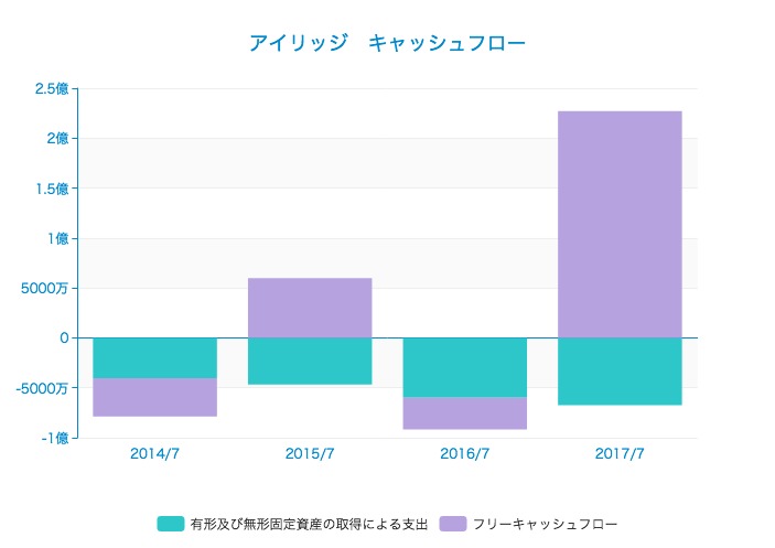 2016/7期は営業キャッシュフローが2015/7期や2017/7期に比べて少なかったため、フリーキャッシュフローがマイナス3150万円となっています。