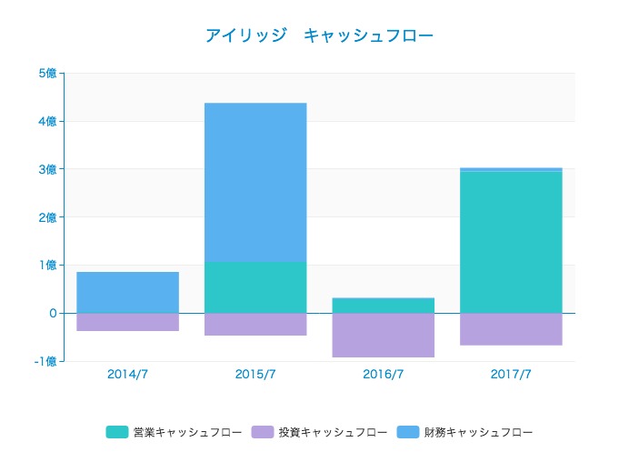 2017/7期において営業キャッシュフロー2億9463万円、投資キャッシュフローマイナス6749万円、財務キャッシュフロー747万円となっています。