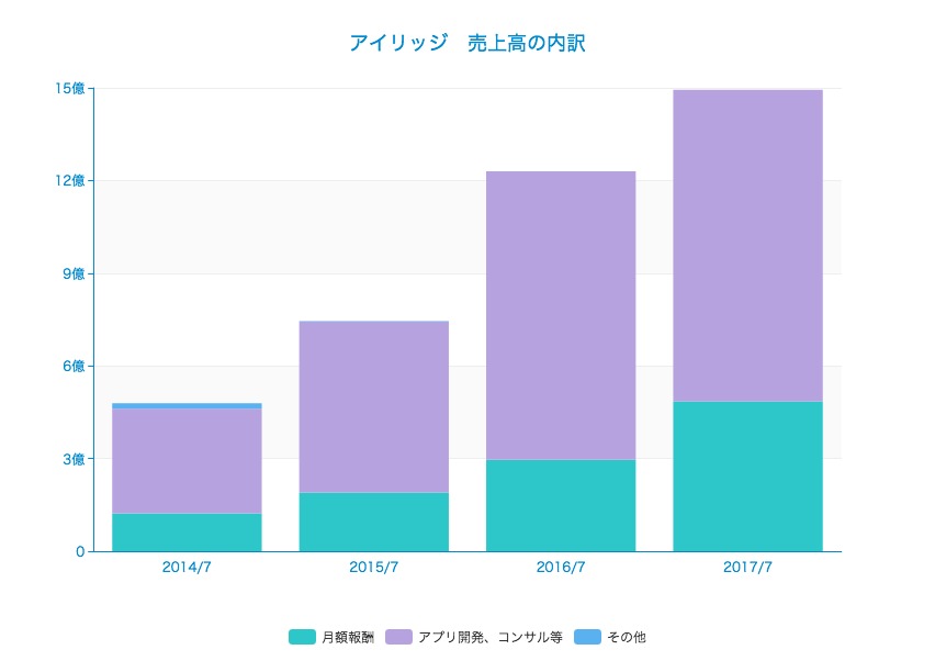 2017/7期は、月額報酬が4億8489万円に対し、アプリ企画・開発やコンサルなどが10億845万円の売上をあげています。