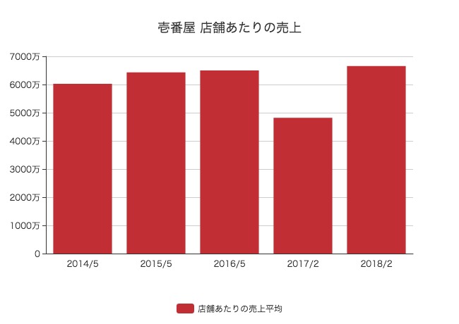 店舗あたりの売上は年間6025万円(2014/5期)から6654万円(2018/2期)と、年々拡大しています。