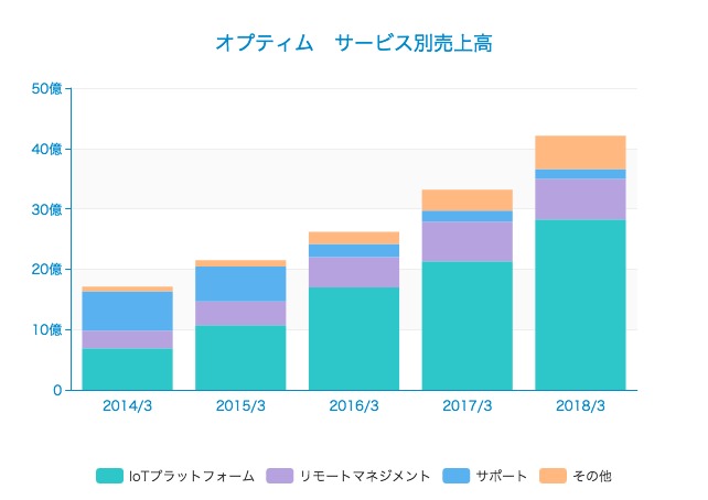 2018/3期における売上高は、IoTプラットフォームサービス28億円、リモートマネジメントサービス6億円、サポート1億円、その他5億円となっています。