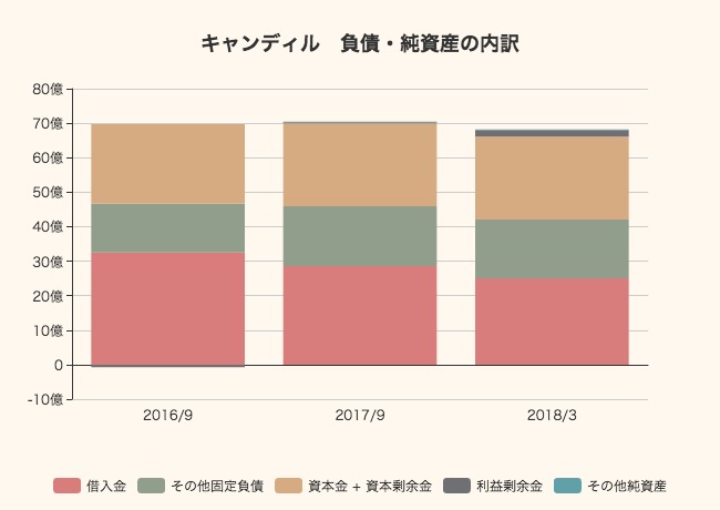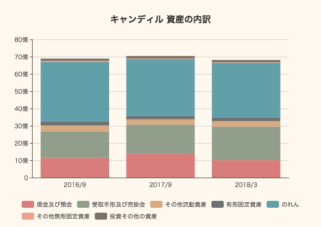 2018年3月末時点での総資産68億円のうち、「のれん」がおよそ32億円を占めています。近年の積極的な買収によりのれんが多く計上されていることがわかります。