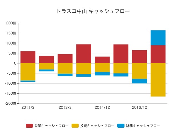 キャッシュフローの状況をみると、毎年30億円から100億円ほどの営業キャッシュフローを稼いでおり、投資キャッシュフローも概ねその範囲に収まっていました。